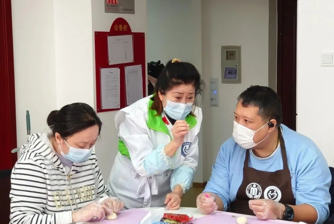 在中式面点苹果包制作服务中,服务对象与同伴们围坐一堂,专注地揉捏面团,将面点材料化作一个个憨态可掬的“苹果包”。活动期间,服务对象小梧向工作人员展示了自己平日制作的小苹果手工作品,红扑扑的“苹果”与新鲜出炉的香喷喷的苹果包,都是小梧的康复成果。相信此后,小梧及其同伴们,都可以凭借自己的特长走出一条属于自己的特色职业康复道路。