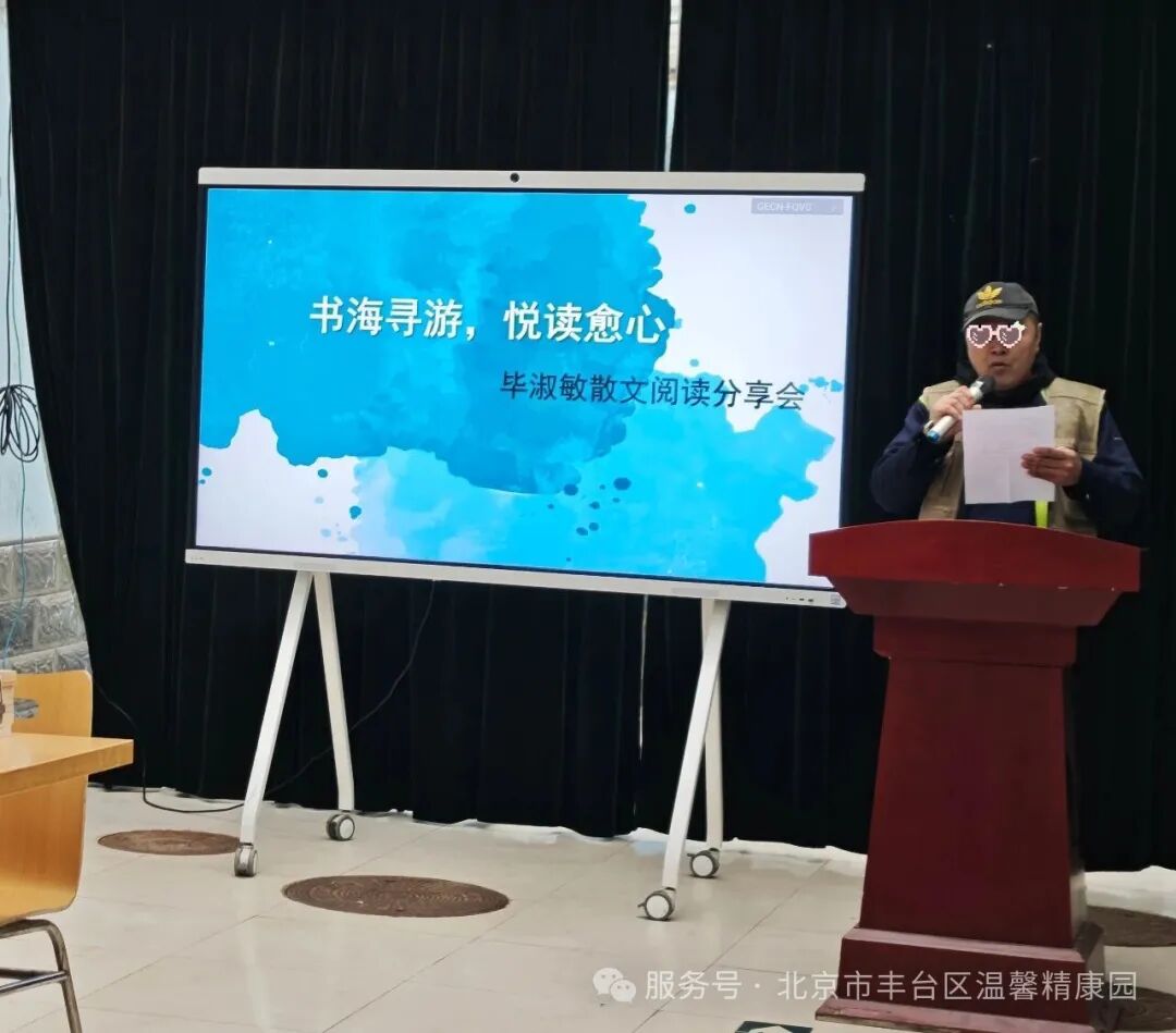 朗读中,康复员依次上台,他们带着不同的阅读感受和相同的朗读热情,用清朗的声音为大家诵读。当读到“幸福有时很微小,需要提醒才能铭记”朗读者的声音变得柔和了。她把自己的读书体会融入字里行间,把优美的文字转化为流动的思想。他们沉浸在这片文学的时空里,聆听、感悟、分享。冬日的暖阳透过玻璃洒下一片温暖,每个人的脸上都洋溢着温暖的笑容。